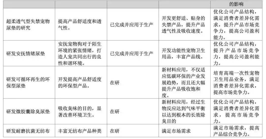 公司目前还有多个研发项目,包括可循环再生的环保型尿垫、微胶囊除臭尿垫等。公司通过持续的高研发投入和产品创新,更好地满足市场的需求。