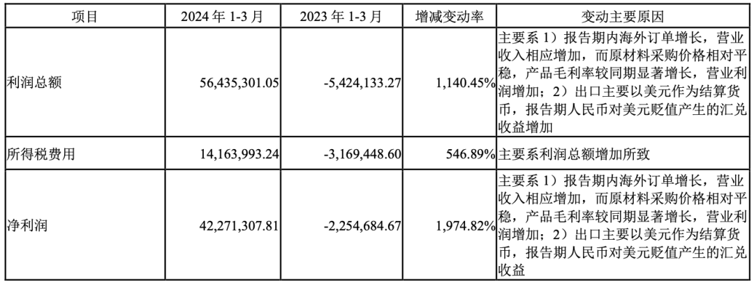 2024年一季度,依依股份营业收入为3.84亿元,同比增长35.18%,归属于上市公司股东的净利润4227万元,同比大涨1974.82%。公司将净利润增加的原因归结为:1. 报告期内海外订单增长,营业收入相应增加,而原材料采购价格相对平稳,产品毛利率较同期显著增长,营业利润增加;2. 出口主要以美元作为结算货币,报告期人民币对美元贬值产生的汇兑收益。