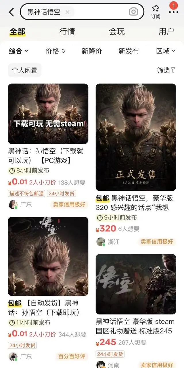 不过,截至发稿时,闲鱼平台上依然可以搜到大量超低价,甚至不足1毛钱所谓的黑神话悟空的下载购买链接。