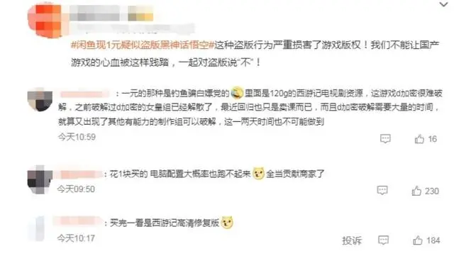 有网友呼吁支持正版,“不能让国产游戏的心血被这样践踏”,也有网友疑似购买过该低价版游戏,称“一元的那种是钓鱼骗白嫖党的,里面是120G的西游记电视剧资源”。