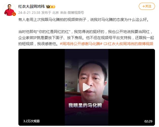8月22日消息,周鸿祎日前发微博,公开感谢马化腾支持。周鸿祎表示:“有人老用上次跟马化腾拍的视频做例子,说我对马化腾的态度为什么这么好。当时他那句‘你的红是网红的红’,我觉得说的挺好的,我也公开地说我要当网红,企业家做IP就是要放下面子、放下身段。他不但在视频号平台支持我,还跟我一起拍短视频,我很感谢他。”