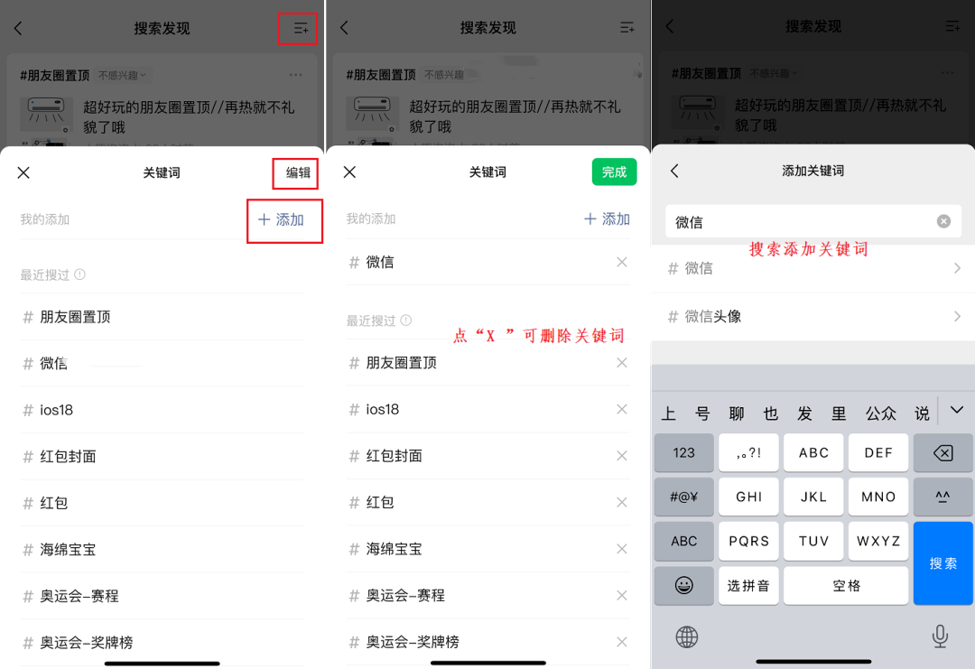 “搜索发现”也提供个性化定制服务,允许用户根据个人喜好与需求设定个性标签。比如,你想添加或者删除某个话题,可以点击右上角 “三” 功能,之后通过“编辑”来删除不感兴趣的关键词话题,或者点击“添加”搜索关键词来添加更多感兴趣的关键词标签。如果页面展示的相关话题内容没有你喜欢的,也可以点击话题后的“…”,选择“浏览更多内容”,就会跳转至该话题的页面,这里会根据先后时间展示相关内容。