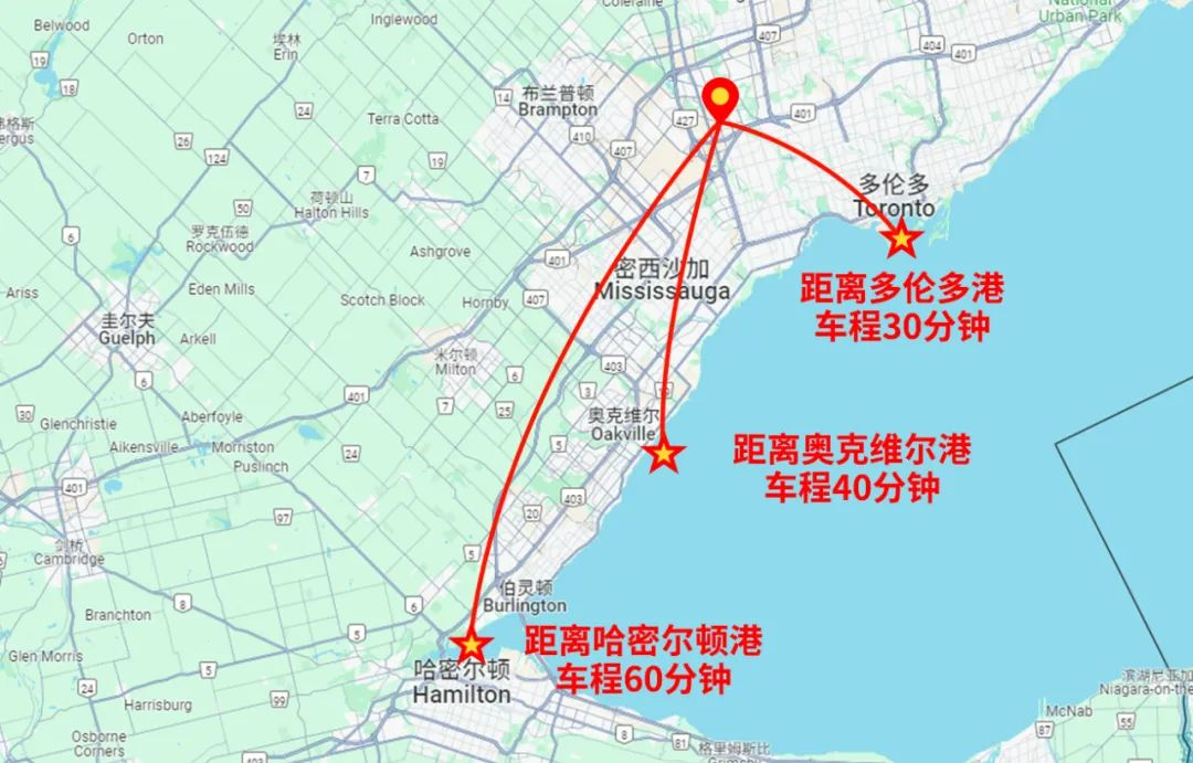 【WPTO1】的选址经过精心考量,它毗邻多个重要港口及FBA仓库,地理位置得天独厚,距离多伦多港仅30分钟车程,哈密尔顿港60分钟,奥克维尔港40分钟,更覆盖了多个FBA仓,其中与最近的FBA仓库仅需20分钟车程。