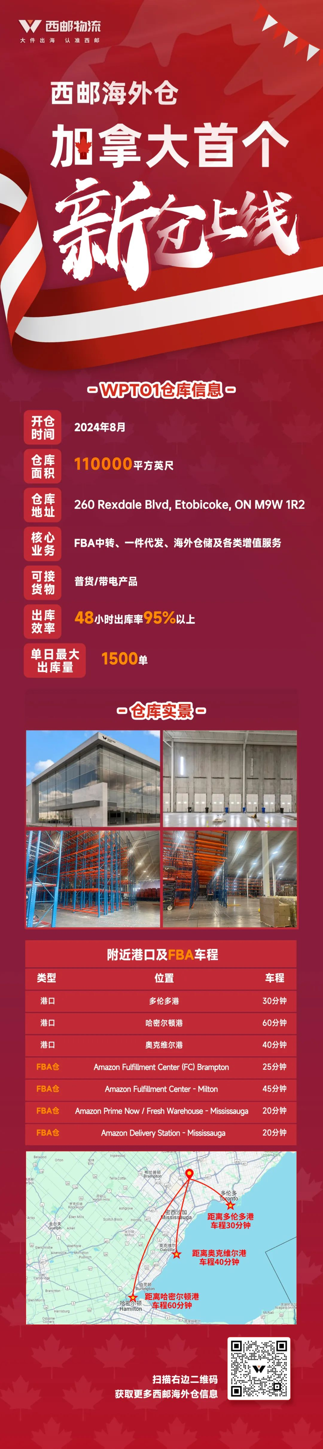 【WPTO1】新仓位于加拿大多伦多市,仓储面积为110000平方英尺,宽敞的仓储空间,为海量货物的存储与快速流转提供了坚实的基础,无论是普货还是带电产品,【WPTO1】均可承接。