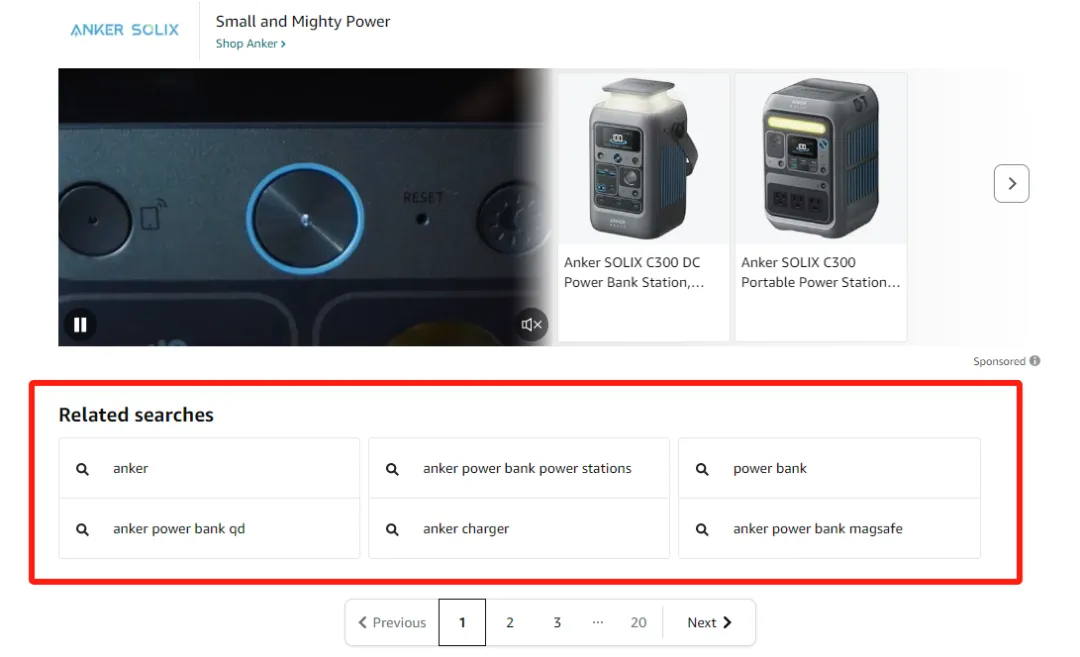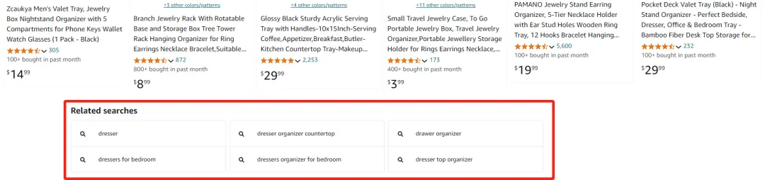 关联关键词的位置处于每页搜索结果页末尾(在翻页位置的上面),意味着卖家如果在首页没有找到目标产品,亚马逊将在买家决定翻页前为买家提供更精准的关键词建议,引导买家进行二次搜索。