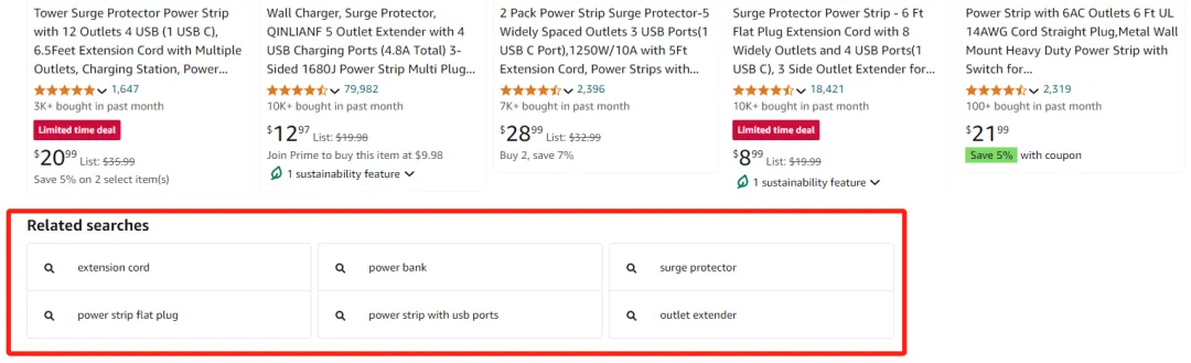 关联关键词与传统的下拉框推荐关键词有所不同(如下图所示),比如搜索“power strip”会出现“extension cord”、“surge protector”。大家可以去搜索观察一下自己产品的一些推荐搜索词,这些关键词会根据买家的搜索词来推荐,往往可以更好地满足买家的需求。