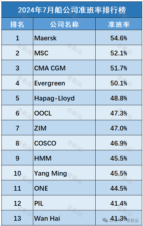 在2024年7月,马士基成为13家船公司里是最可靠的航运公司,准班率为54.6%;其次是地中海航运MSC,船期准班率为52.1%;法国达飞排在第三位,准班率为51.7%;长荣海运仅以50.1%的准班率排在第四位