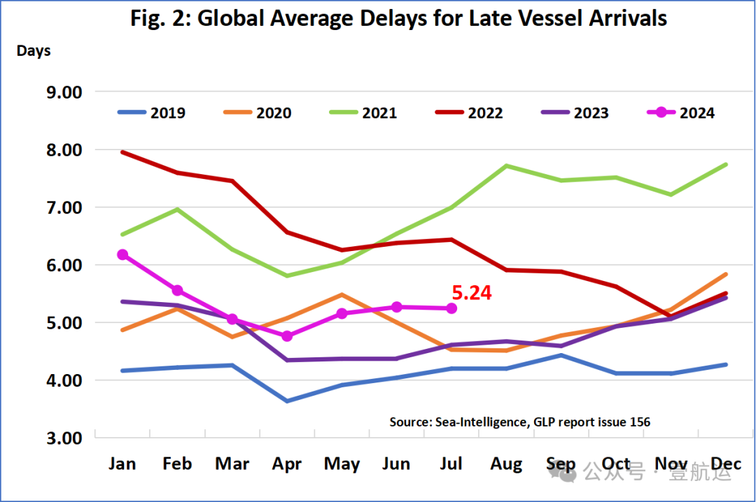 与此同时,2024年7月,船舶逾期抵港的平均延误时间有所改善,虽然幅度不大,但月平均延误时间减少了-0.02天,至5.24天。这一数字仅次于2021-2022年的疫情高峰。