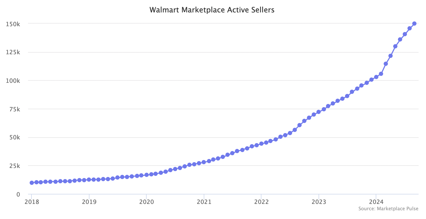 根据 Marketplace Pulse 的数据,在过去的 12 个月里,沃尔玛增加了 5 万多名活跃卖家。而此前,沃尔玛公布的数据显示,截至 2022 年,其活跃卖家总数为 5 万。过去一年的显著增长是一个重大进步,这将巩固沃尔玛作为多数市场卖家第二重要渠道的地位。