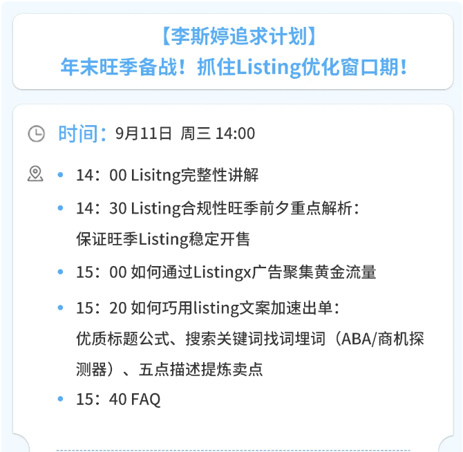 9月11日有一场Listing优化课程直播,我们将重点探讨如何通过精准的Listing优化、合规性检查和广告策略,抓住年末旺季黄金流量,促进销量飙升。千万不要错过!