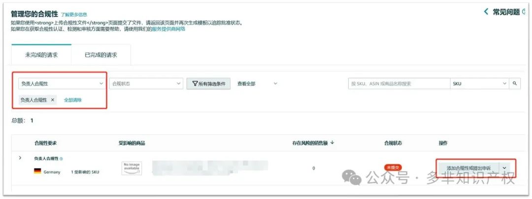 2. 在未完成的请求处→下拉选择【负责人合规性】→点击【添加合规性或提出申诉】