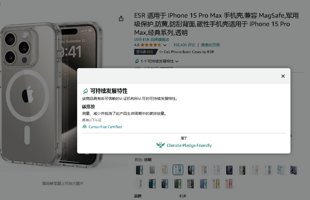 作为电子配件领域的畅销品牌,ESR 亿色选择带上了气候绿标CF认证,其产品在亚马逊上的表现尤为突出。