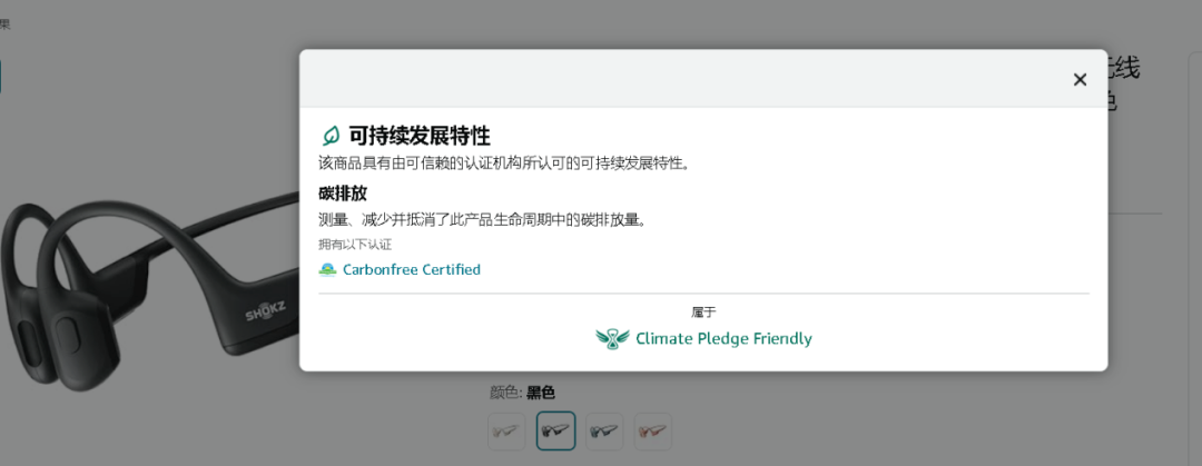 (如图所示,韶音通过CF方案给自己的耳机产品上了气候绿标)
