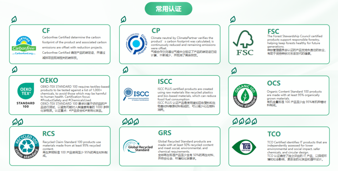 目前市面上比较常见的认证包括CF、CP、GRS、FSC、OEKO、ISCC、RCS、TCO、OCS这9种,几乎涵盖了所有类型的产品,满足各类企业的多样化需求。