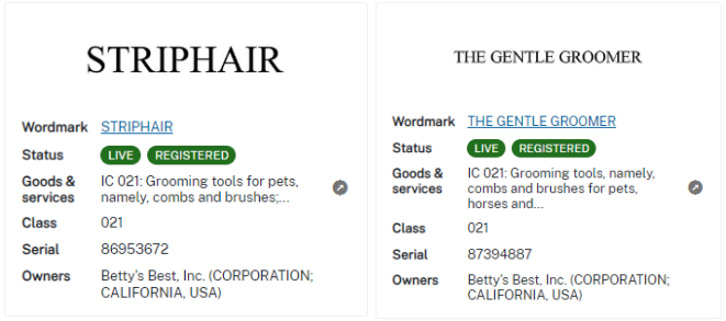 文字商标StripHair和The Gentle Groomer注册在21类宠物美容工具梳子和刷子等类目: