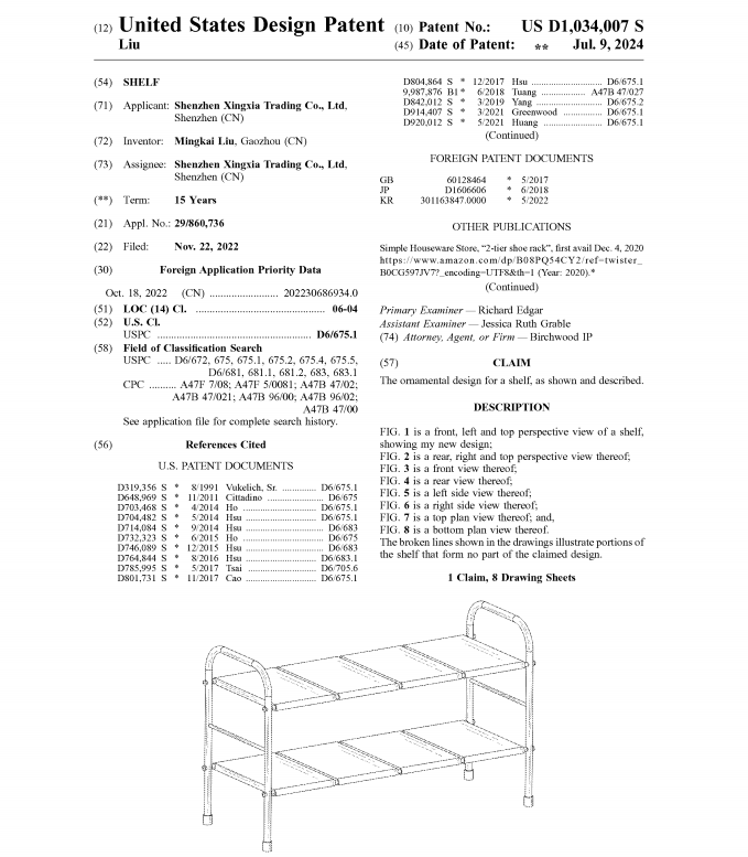涉及名为Shelf的美国外观专利,专利号USD1034007S,2022年11月22日提交申请,2024年7月9日下证,下证2个月便火速维权: