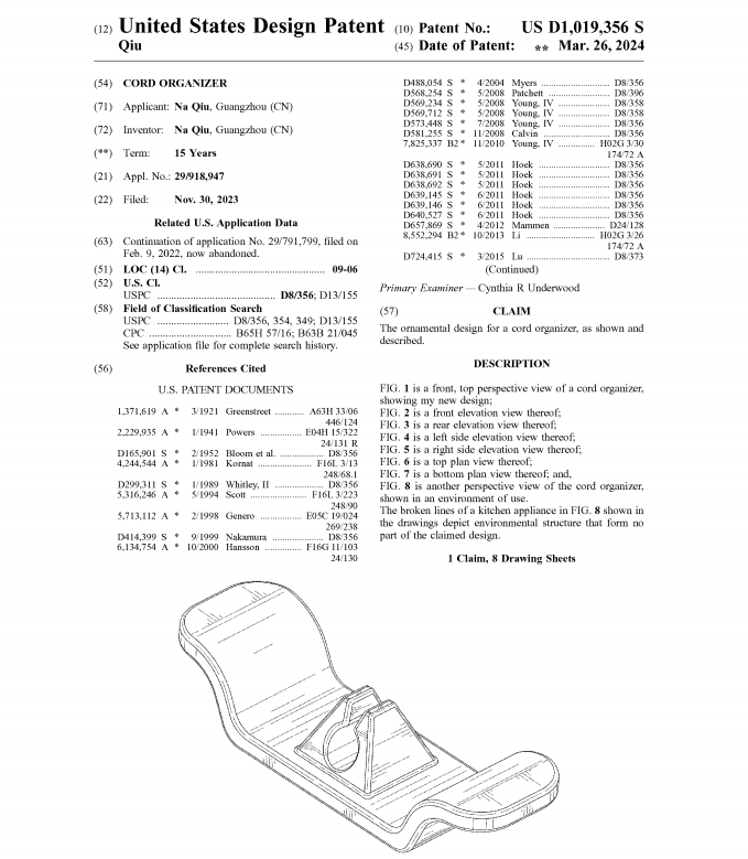 专利名称Cord organizer,专利号USD1019356S,2023年11月30日提交申请,2024年3月26日下证: