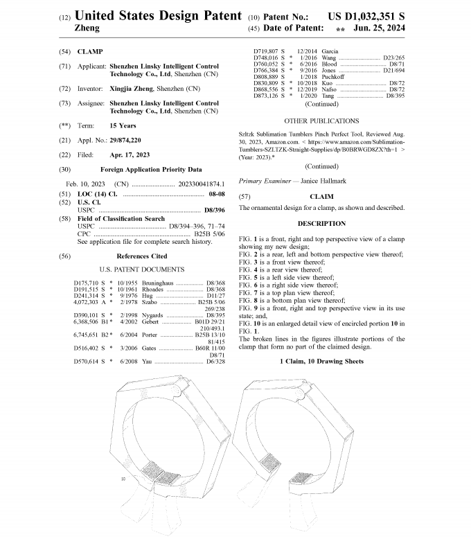 专利名称Clamp,专利号USD1032351S,2023年4月17日提交申请,2024年6月25日下证:
