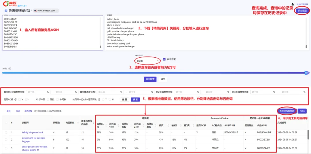 或者借助关键词工具,如词匠「关键词判断(肯否)」。根据搜索结果里的首页、前两页、前三页的关键词精准度情况,以及每个关键词、竞品数量、首页产品数、是否为AC标等因素进行判断。