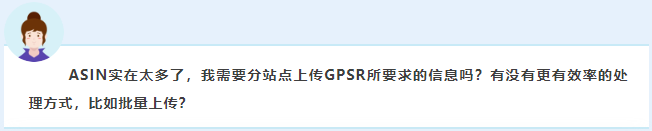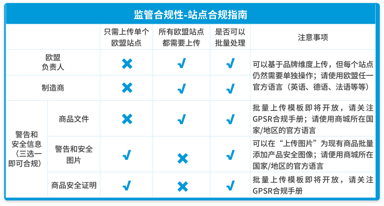 因为GPSR所要求上传的信息多达5种,每种信息的属性不同,所以情况是不一样的。请您参考以下表格了解不同信息的站点合规指南以及是否支持批量处理: