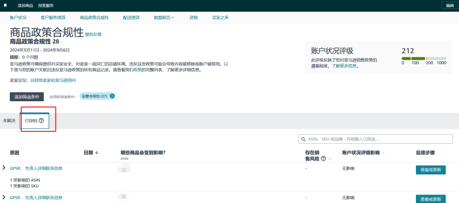 如果您的品牌或ASIN已移至监管合规性页面中的“已存档”子页面(如下图),或移至管理您的合规性页面中的“已完成”子页面,则视为合规。