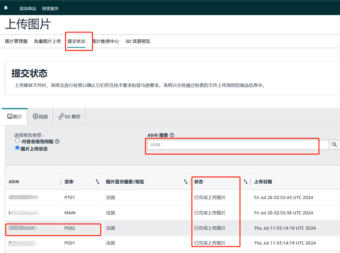 u 若您上传的是产品安全图片(PS01-PS06),请前往任意一个欧盟站点>目录>上传图片>提交状态>输入对应的ASIN>查看上传状态是否已完成上传图片,且图片代码为PS01-PS06。