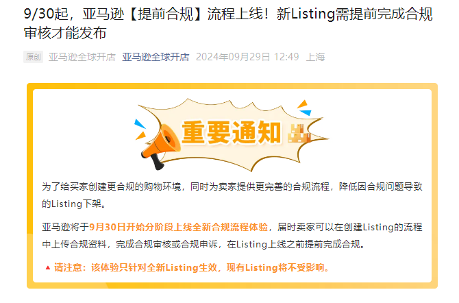 亚马逊官方发文,从2024年9月30日起(从明天起),为了降低因合规问题导致的listing下架问题,将推出全新【提前合规流程】。即完成listing创建后需提交合规材料完成合规审核后,才能发布listing。