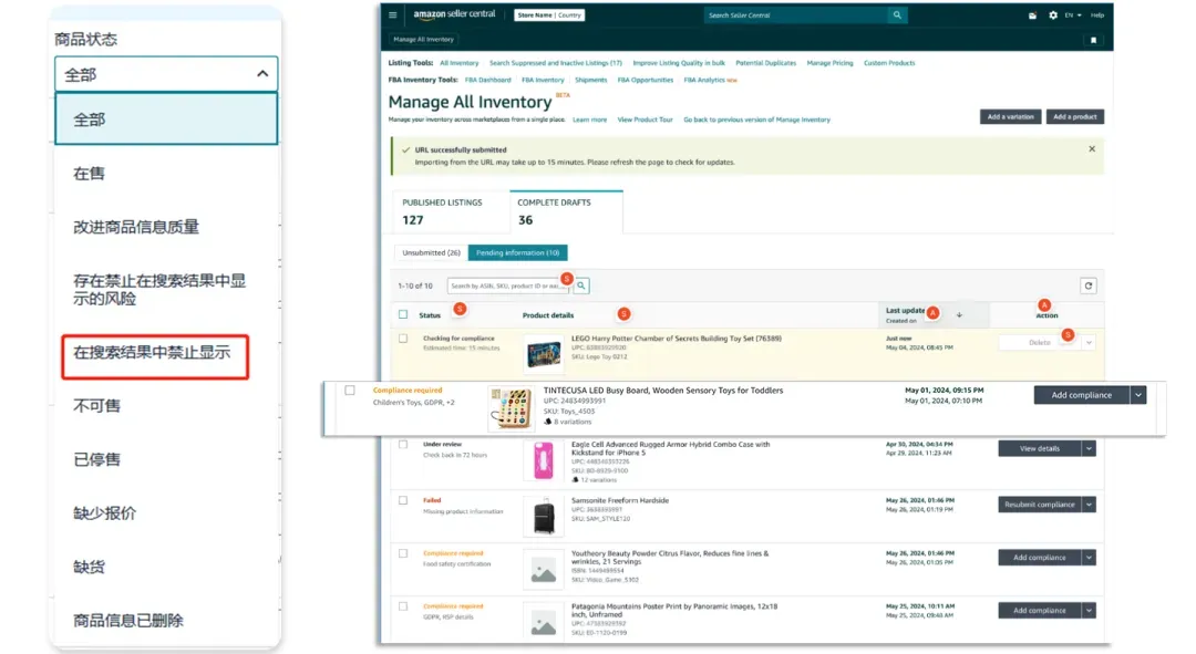 之前的流程是:当卖家创建全新的listing时,只有填写listing的相关参数就能直接发布销售了。当系统检测到合规问题时,卖家只需要在特定时间内完成上传,亚马逊审核成功,就没问题了。