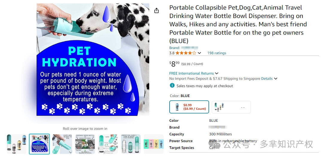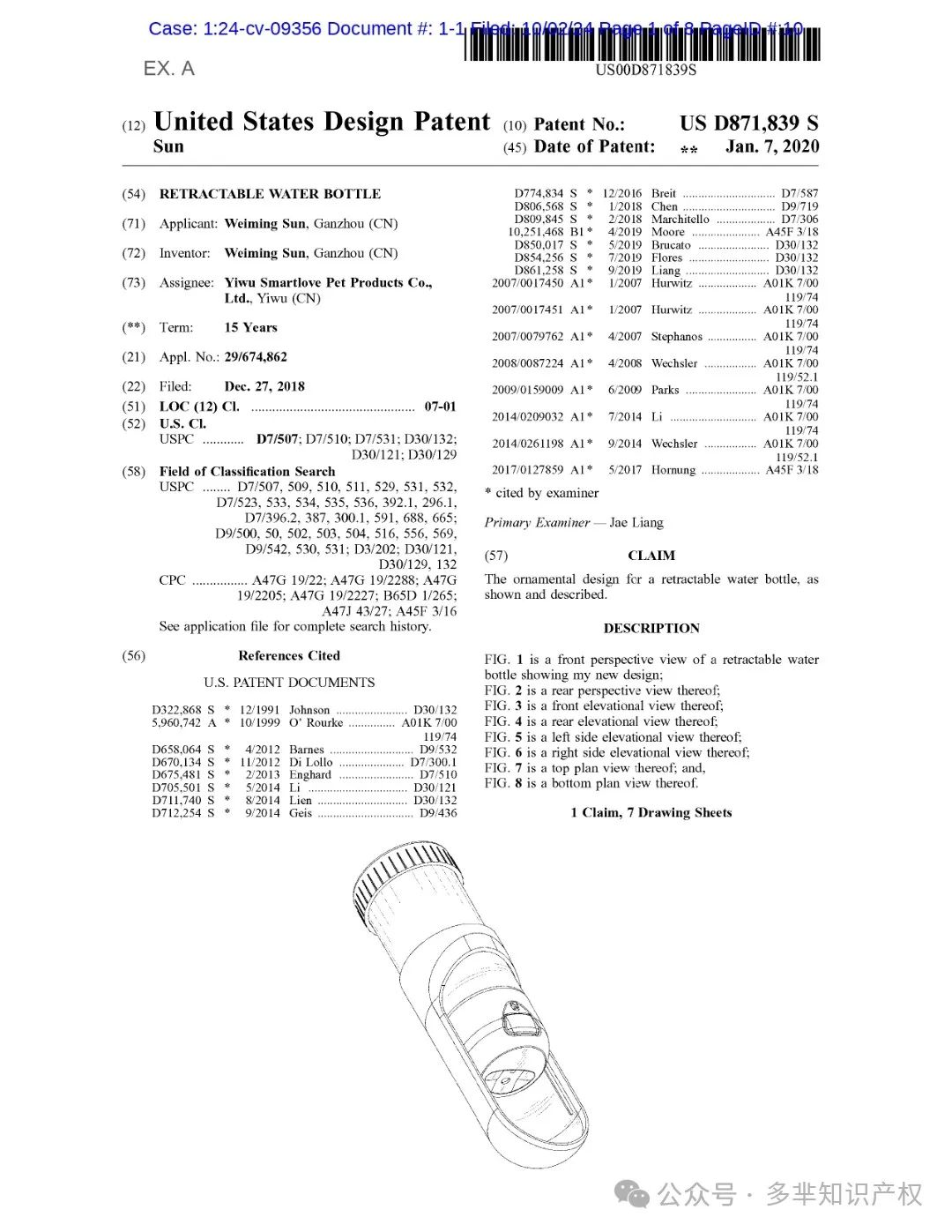 原告同样是国人卖家,名下拥有美国专利D871839,该专利名称为 “RETRACTABLE WATER BOTTLE”,于2018年12月27日申请,2020年1月7日下证。