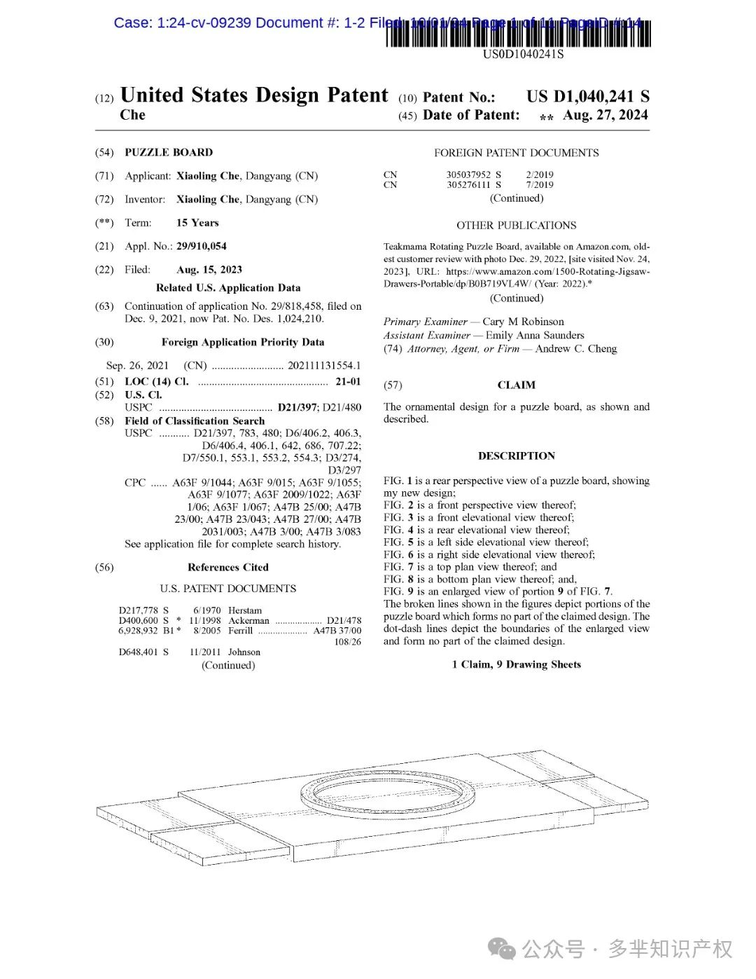 原告为中国湖南的卖家,是美国专利D1040241的合法受让人,该专利名称为 “PUZZLE BOARD”,于2023年8月15 日申请,2024年8月27日下证,该专利引用了中国专利的优先权。