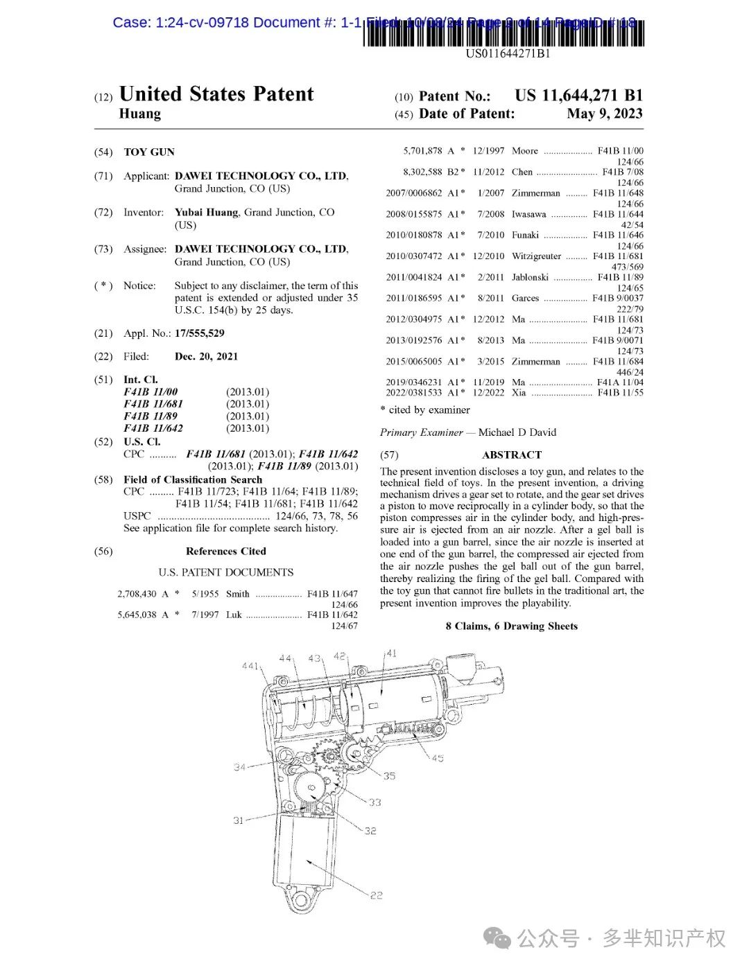 原告Lovitedo, LLC是美国特拉华州的一家公司,今年以来,已发起多起涉及不同专利的TRO案件。本案涉及的发明专利提供一种玩具枪,实现更安全的凝胶球发射。