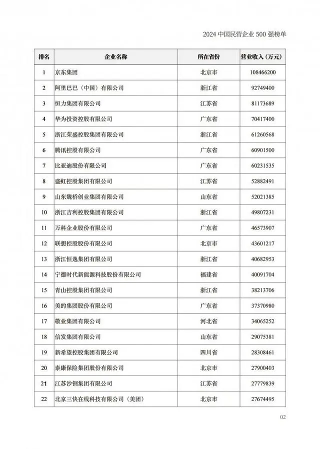 全国工商联10月12日发布“2024中国民营企业500强”榜单和《2024中国民营企业500强调研分析报告》。