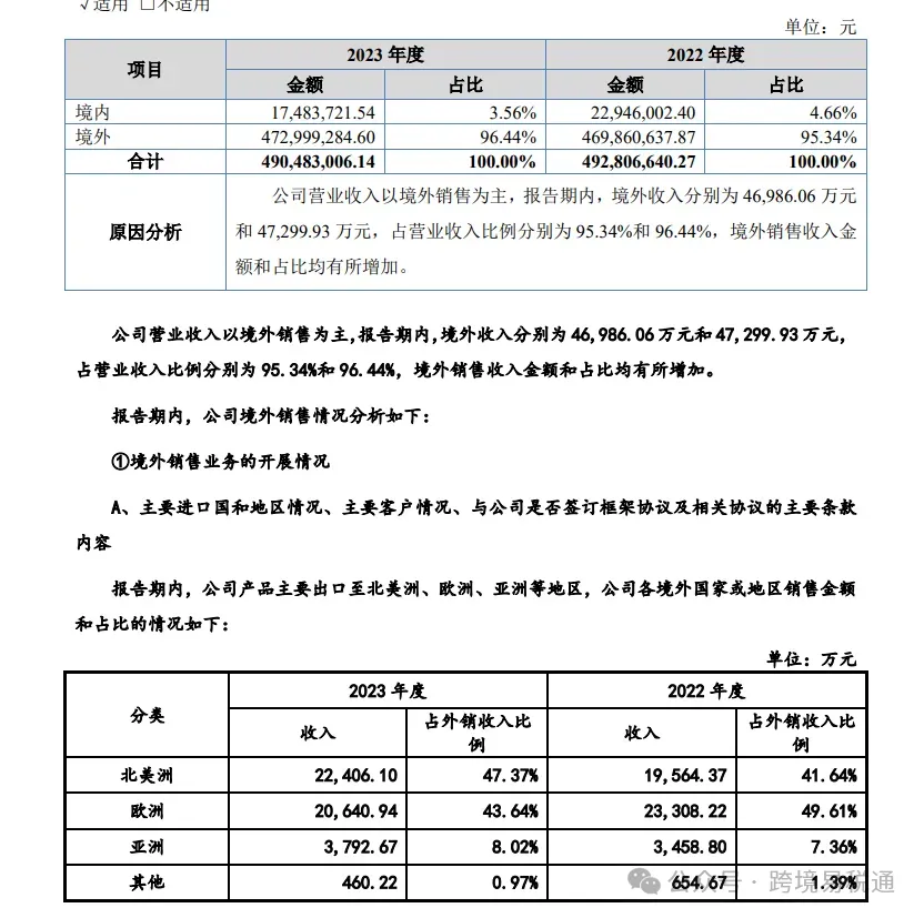 与此同时,欧洲与北美洲是耀泰股份的主攻市场。2023年,耀泰股份在北美洲与欧洲的销售额分别达到2.24亿元、2.06亿元,占外销收入比例分别达到47.37%、43.64%。