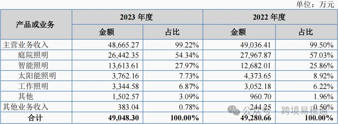 耀泰股份的销售收入,主要来源于户外照明器具销售,尤其是庭院照明。2023年度,庭院照明的营业收入为2.64亿元,占总营业收入的比例为54.34%;智能照明的营业收入为1.36亿元,占比为27.97%;太阳能照明的营业收入为3762.16万元,占比为7.73%;工作照明的营业收入为3344.58万元,占比为6.87%。