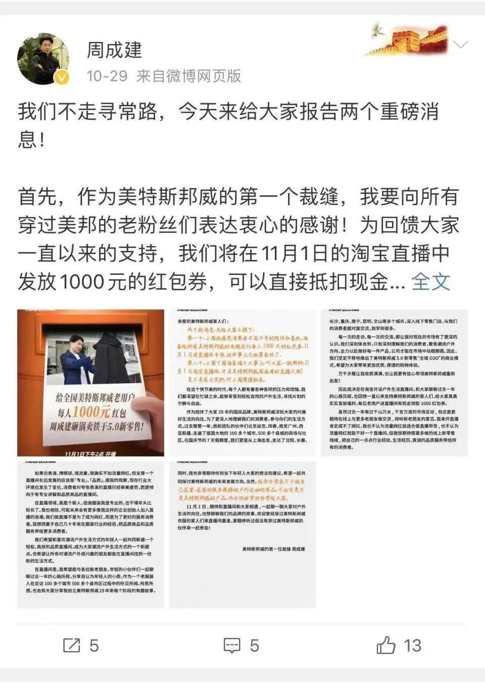 10月29日,周成建通过官微公开宣布,将于11月1日开启直播首秀。