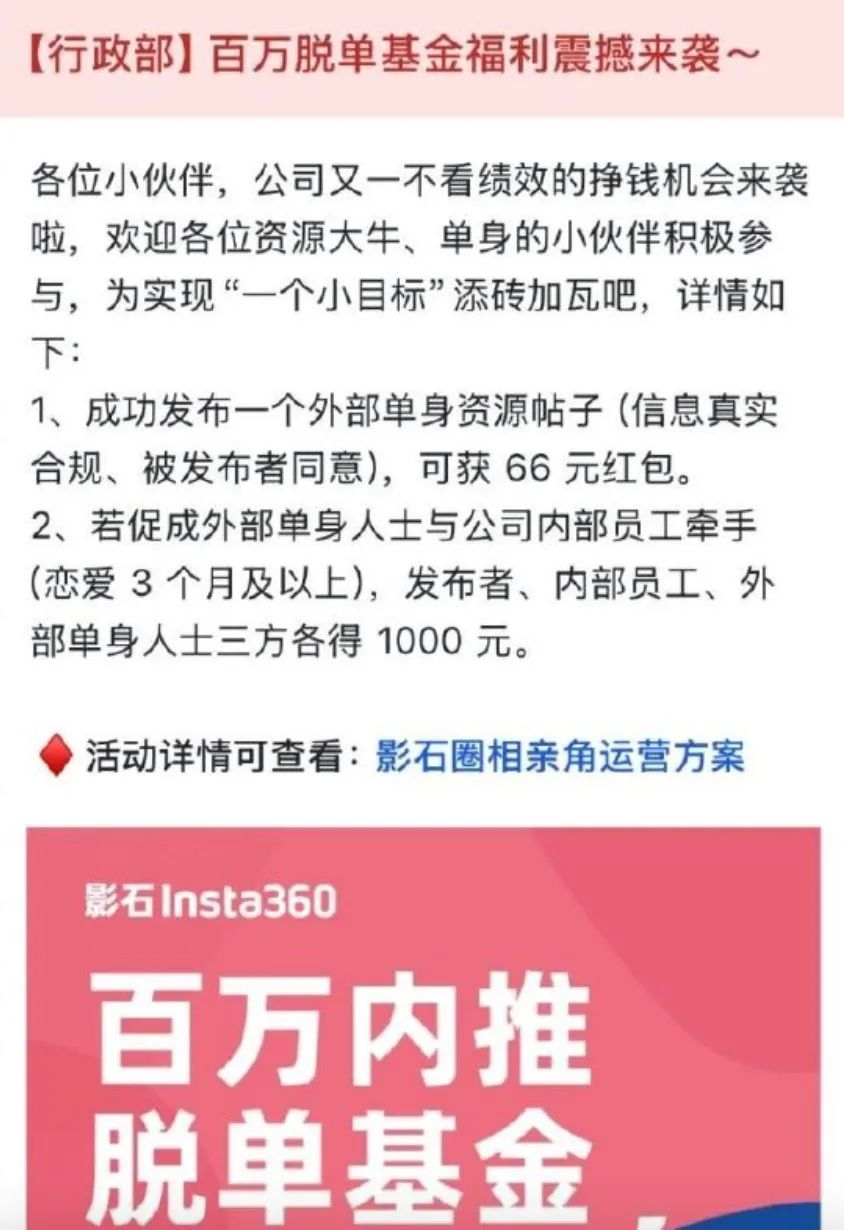 光棍节前夕,影石创新行政部发布百万脱单基金福利通知,发布单身帖子资源,可以获得66元红包。如果“牵手成功”,介绍人、公司内外单身人士都可以奖励1000元!