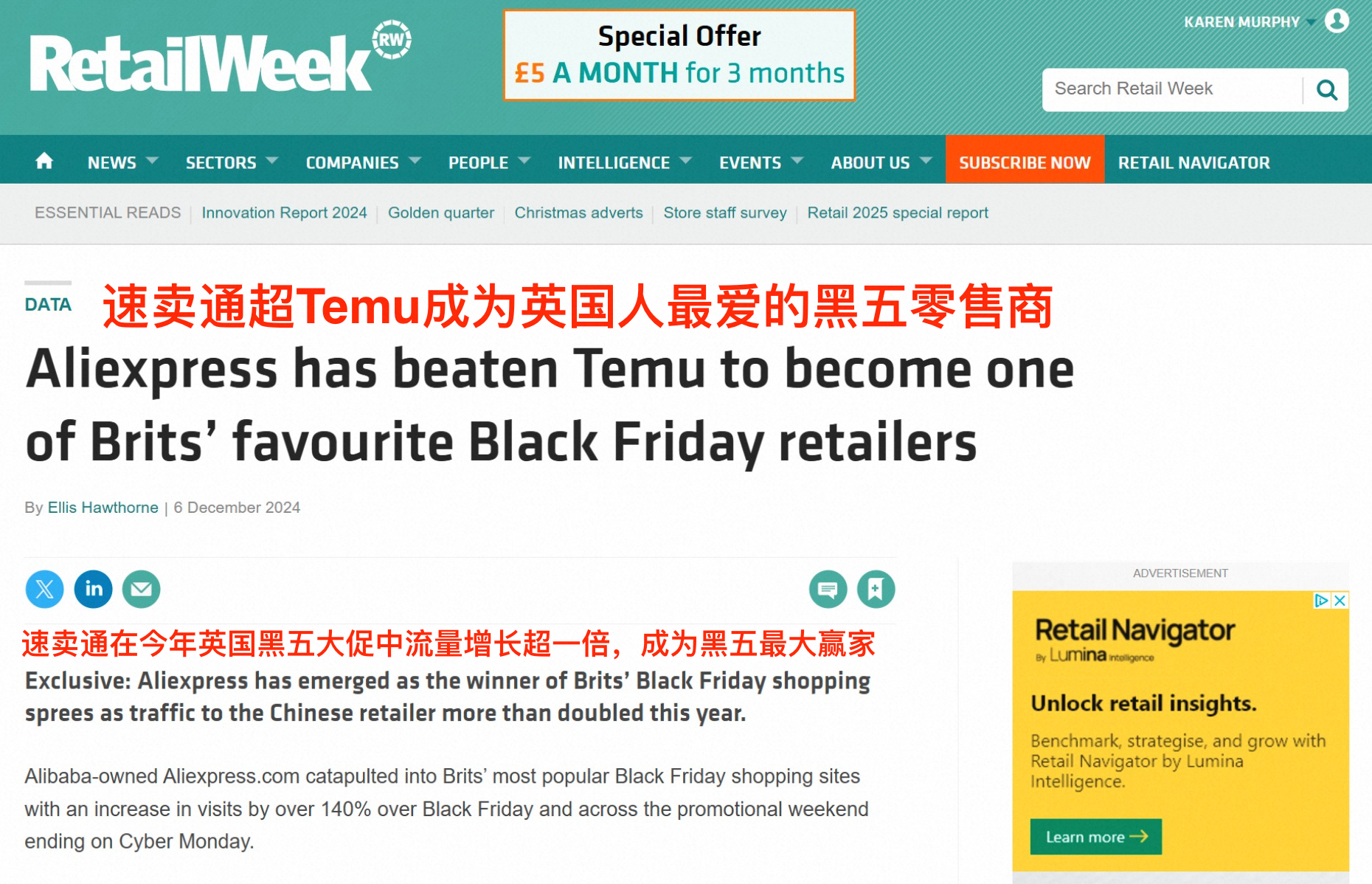 据英国媒体报道,市场流量分析机构Similar Web数据显示,速卖通 AliExpress在今年的黑色星期五流量同比增长140%,超越Temu、耐克及苹果网站,成为英国人最喜爱的黑五购物平台。