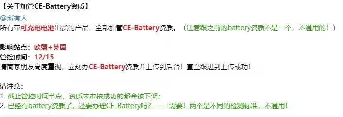 2024年12月15日之前:所有涉及电池的产品,必须确保提供有效的CE认证和相关合规文件。如果未在此日期前完成上传,相关产品将无法继续销售,甚至可能会被下架。
