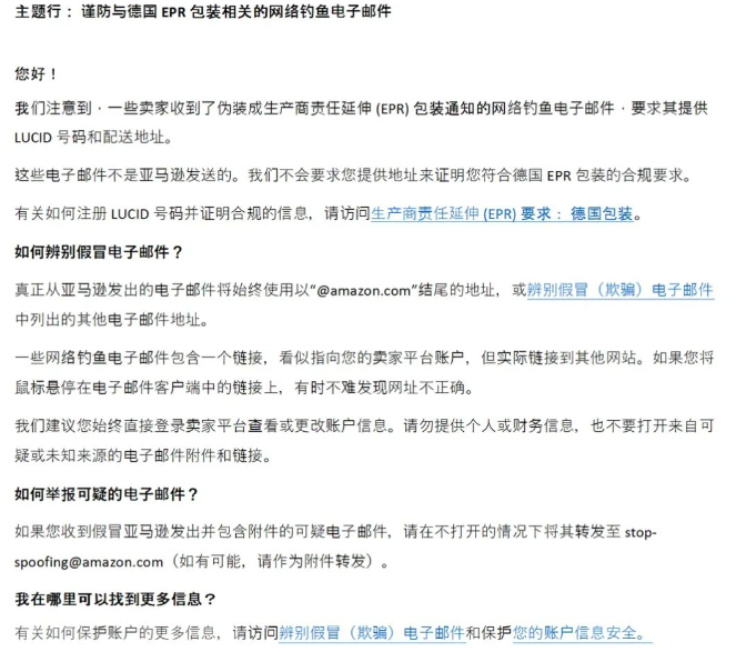 除了身份验证的骗局外,骗子还利用EPR包装法的通知对德国站卖家进行诈骗。