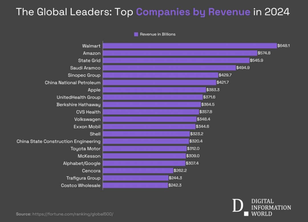 日前,《财富》杂志公布了2024年全球收入最高公司榜单,沃尔玛以6481亿美元的收入稳居榜首,再次证明了其作为全球零售巨头的强大实力。作为美国最大的零售商,沃尔玛凭借其广泛的国际影响力和深厚的消费者基础,持续领跑全球零售行业。
