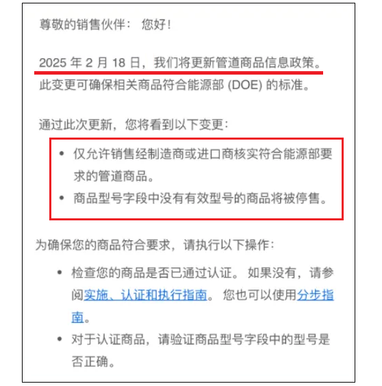 也就是说,以后亚马逊美国站所有管道类的产品,都需要提供美国DOE认证,然后才能正常销售,未提供认证的到时都会被亚马逊禁售。