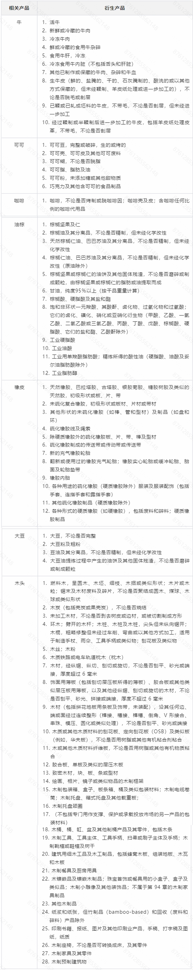 欧盟EUDR适用于下述所有商品,未列入表格的产品不受法规约束,例如,肥皂即使含有棕榈油,也不受该法规的约束。