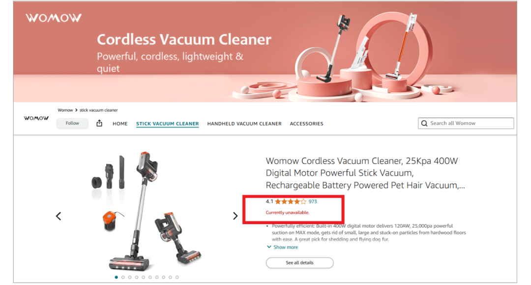 近日,有粉丝爆料,亚马逊清洁电器类目的知名品牌Womow,已经下架了全部的产品。