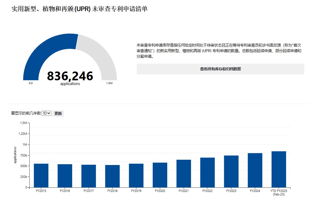 根据USPTO公布的最新数据,目前待审专利申请已突破92万件,其中发明、植物、再颁专利超83.6万件,外观专利超8.4万件,且每日新增量达千余件。随着新聘1600名审查员的计划落空,积压案件或突破百万大关。