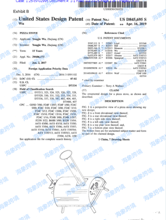 ●案件参数: 起诉时间:2025/3/21 案件号:25-cv-2995 原告品牌:PIZZA STOVE 披萨炉 律所:Dewitty And Associates, Chtd. 起诉类型:外观专利 本案原告为中国籍,涉及专利为一项美国外观设计专利,专利号为USD845695S。该专利最初申请日期为2017年6月2日,并于2019年4月16日正式授权。自此之后,任何上架的与该专利外观设计相似的产品均可能构成侵权风险。 注册外观专利: 本案原告为中国籍,涉及专利为一项美国外观设计专利,专利号为USD845695S。该专利最初申请日期为2017年6月2日,并于2019年4月16日正式授权。自此之后,任何上架的与该专利外观设计相似的产品均可能构成侵权风险。 刊登举例: