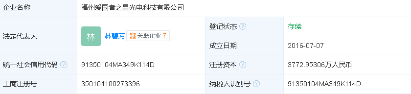 根据备案信息,爱购控股在国内的运营实体为福州爱国者之星光电科技有限公司(下称“爱国者之星”)。天眼查数据显示,该公司成立于 2016 年,总部位于福建省福州市,企业注册资本 3772.95 万元人民币,法人代表为林碧芳。在股权结构上,爱国者之星由福州爱购聚星投资有限公司全资控股,后者则完全由 AIGO HOLDING LIMITED 实际控制。