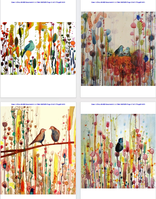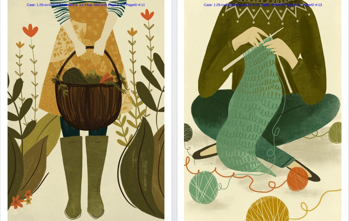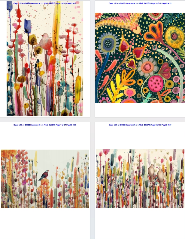 Sylvie Demers 案件编号:2025-cv-04403 起诉时间:2025年4月23日 原告律所:Keith 原告方:Sylvie Demers 侵权原因:版权侵权 Sylvie Demers 是一位来自加拿大蒙特利尔的现代画家,她创作的艺术作品色彩丰富、质感丰富,并运用突破传统的创作技巧,经常将水彩、粉彩和马克笔等媒介巧妙融合。她的作品题材广泛,从花卉到鸟类和肖像,风格以充满异想天开的描绘或抽象画为特色,色彩大胆,想象力丰富。 Tobias Teixeira Da Fonseca 案件编号:2025-cv-04399 起诉时间:2025年4月23日 原告律所:Keith 原告方:Tobias Teixeira Da Fonseca 侵权原因:版权侵权 Emily Holmes 案件编号:2025-cv-04402 起诉时间:2025年4月23日 原告律所:Keith 原告方:Emily Holmes 侵权原因:版权侵权 Emily Holmes于2016年在布里斯托尔创立了自己的插画品牌。现在,她在家乡克利夫登的工作室里,为高品质的印刷品、卡片和礼品创作独特的插画。艾米丽的独特风格是手绘数字艺术品与拼贴复古面料和照片的结合。 如何判断产品是否涉及版权侵权,如何规避与应对侵权纠纷?可查看文章👉: 跨境卖家闯荡美国市场,别让版权纠纷成了“滑铁卢”!美国版权侵权判定标准与赔偿机制分析 如有不幸遇到侵权或者想要发起维权的朋友,可以第一时间联系我们,我们会针对不同案情提供最专业的服务。
