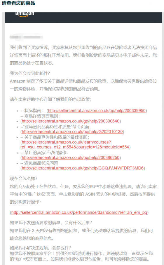 您的商品(ASIN:XXXXXX)因被买家投诉"存在质量问题,无法正常使用",目前平台已采取以下措施: