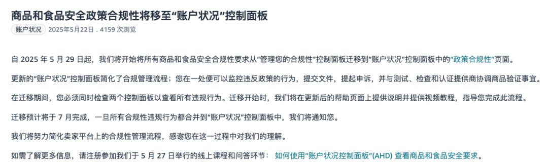 2024年5月22日,亚马逊平台通过后台公告发布系统更新通知,宣布将"商品和食品安全政策合规性"功能迁移至账户状况控制面板。此次看似常规的技术调整,实则引发后续连锁反应:美国站锂电池相关商品于系统更新后遭遇集中审查,大量卖家收到"商品和食品安全违规"绩效通知,涉及产品被强制下架。