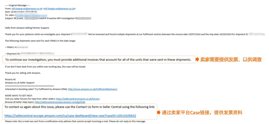 通过卖家平台与调查小组进行沟通,卖家可以通过以下路径找到该case,根据要求提供发票资料。